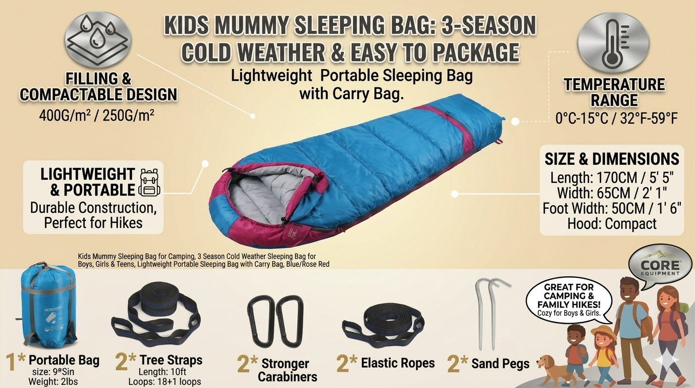 Kids Mummy Sleeping Bag for Camping, 3 Season Cold Weather Sleeping Bag for Boys, Girls & Teens, Lightweight Portable Sleeping Bag with Carry Bag, Blue/Rose Red