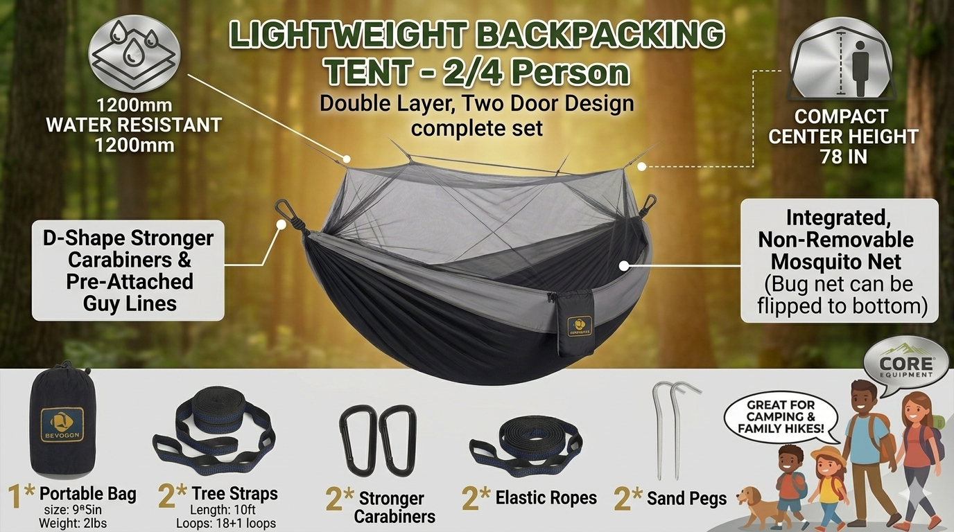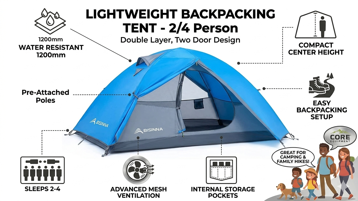 2/4 Person Camping Tent Lightweight Backpacking Tent, Waterproof Double Layer Outdoor Tent with Two Doors, Easy Setup for Camping, Hiking, Hunting & Travel