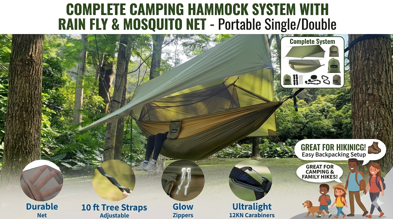 Camping Hammock with Mosquito Net & Rain Fly, Portable Single/Double Hammock Tent with 10 ft Tree Straps, Lightweight Outdoor Hammock for Hiking, Camping & Travel