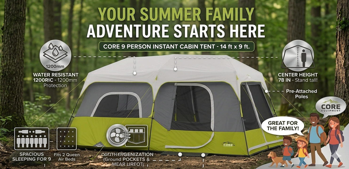 9 Person Instant Cabin Tent 14 x 9 ft with Pre-Attached Poles Weather Resistant Camping Tent with Ventilation and Storage Pockets Green